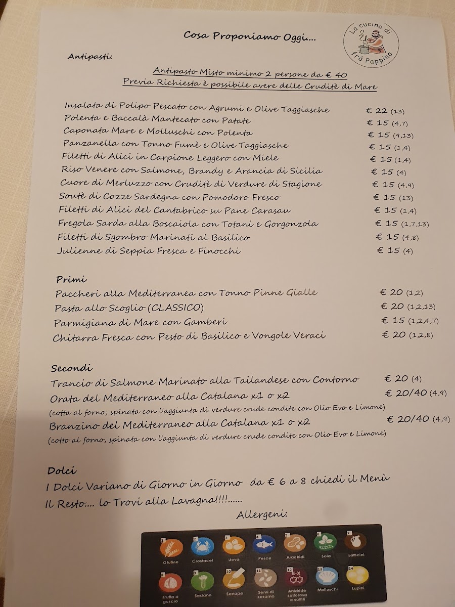 The menu at La Cucina Di Fra' Pappina offers a delightful selection of traditional Italian dishes with a focus on fresh seafood and hearty, rustic flavors. Standout items like Pasta Ai Frutti Di Mare, a flavorful pasta dish brimming with a variety of fresh shellfish, showcase the restaurant's dedication to quality ingredients. Another must-try is the Gnocchi Al Ragù Di Cernia, a perfect balance of tender gnocchi paired with a rich grouper ragù, creating a comforting yet refined experience. For those who prefer a lighter entrée, the Dentice Al Forno, a baked dentice fish, is expertly seasoned and baked to perfection, delivering a delicate taste that highlights the freshness of the catch. The combination of these well-executed dishes creates a menu that reflects both the authenticity and creativity of La Cucina Di Fra' Pappina, making it a standout destination for lovers of Italian cuisine.